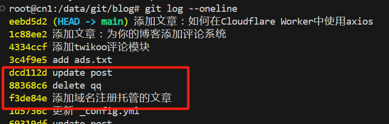如果你已经进行了多次提交,那么就需要用到 git rebase 命令了。首先先用 git log --oneline 看下你的提交记录。