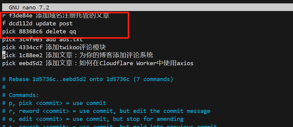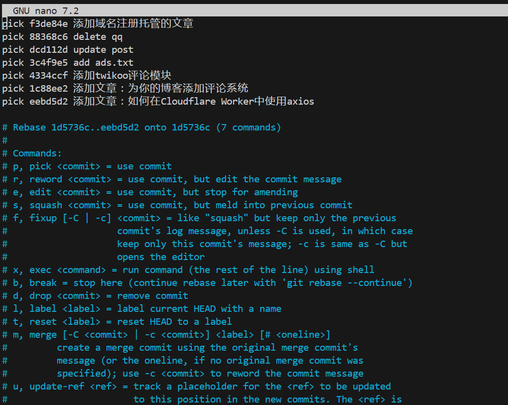 注释前面 pick 开始的行是初始值,也就是我们需要修改的地方,注释部分是帮助文档。这里每一行就是一次操作,执行顺序从上到下,你可以修改初始的执行顺序和操作,如果什么都不改则这次 rebase 操作什么都不会执行。
