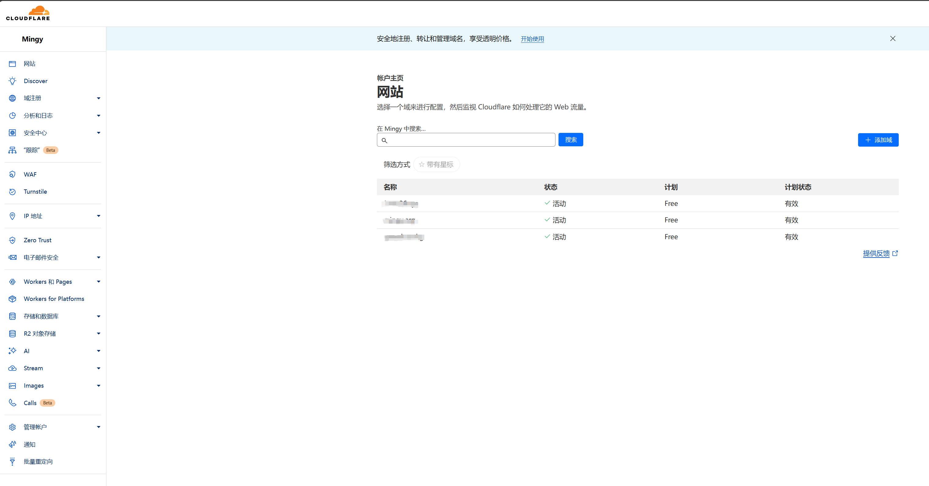 你也可以选择在其他域名商购买域名后转入,可参考博主的另一篇文章 如何注册一个域名并托管到Cloudflare。