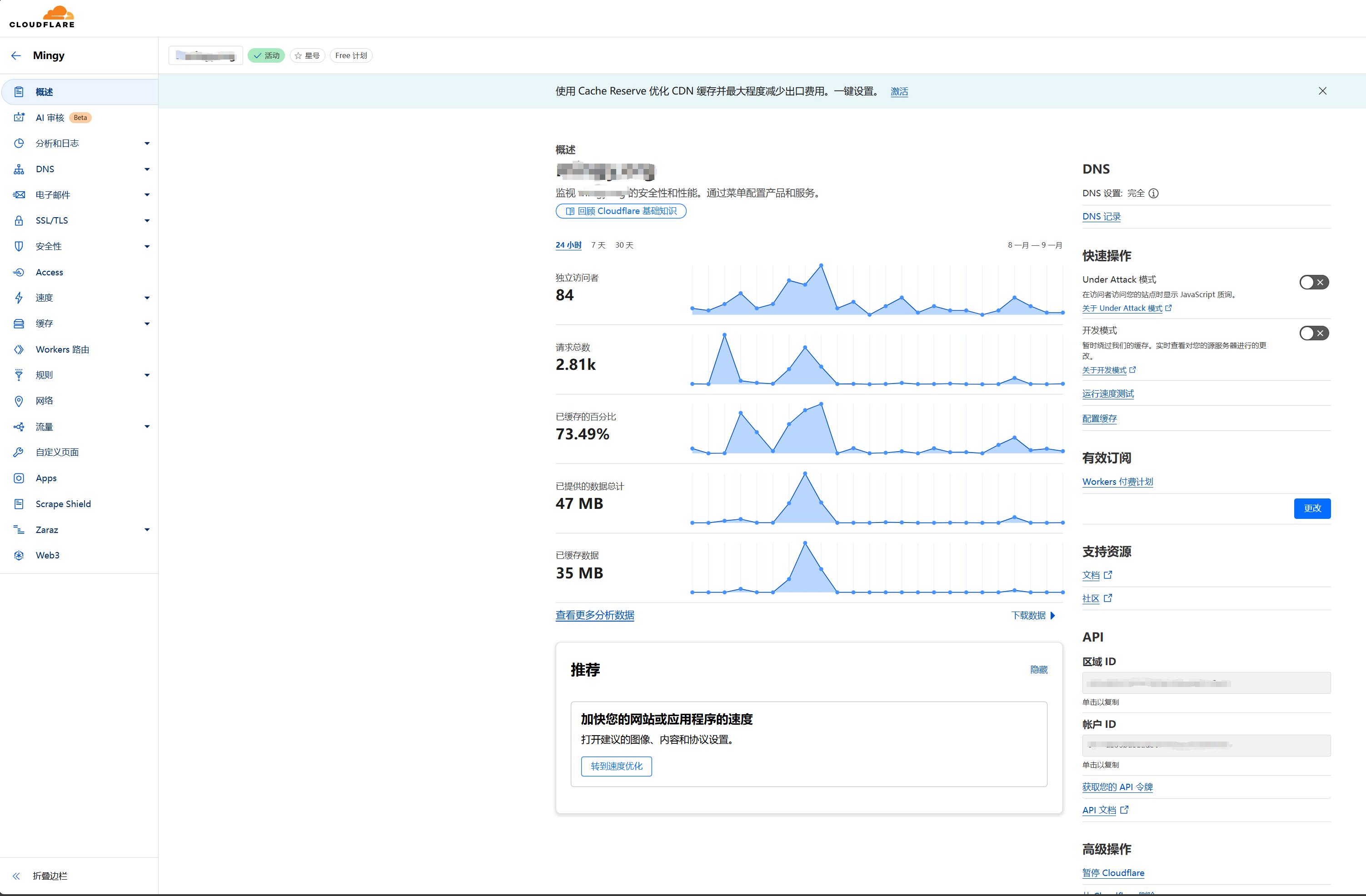 除了一些特别收费的服务,Cloudflare 主要提供的计划有三种,免费计划 是注册就开通的,可以使用大部分主要的能力,一般个人网站,甚至小型网站都足够用了。Workers 付费计划 是针对开发人员提供的付费计划,主要是针对 Workers 和 Pages 和各种分布式存储能力的,价格也不贵,每个月 5 美刀还是很值得订阅的。第三种是针对网站的,订阅网站的付费计划也是只针对该网站的,你可以在首页的网站列表看到每个网站的付费计划。网站付费计划 分三档,专业版、商用版 和 企业版,主要是为网站提供更好的优化、防护能力,价格也不菲,从每月 20 美刀上不封顶,一般的个人或小型网站不建议订阅。下面列出了 免费计划 和 付费计划 在开发能力上的主要区别,更详细的可以在自己的控制面板中查看。