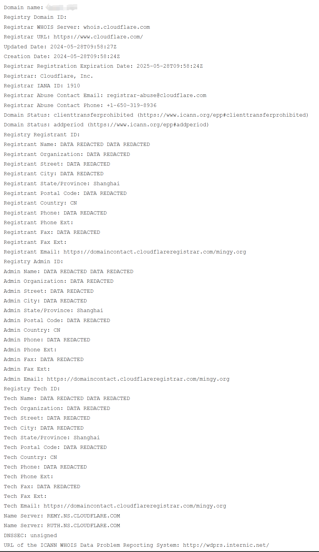 你可以在 Cloudflare 注册域,Cloudflare 可以为你 WHOIS 隐私保护,默认开启了隐私保护的域通过 WHOIS 查询的结果是这样的,你的联系方式等信息都被保护了起来。